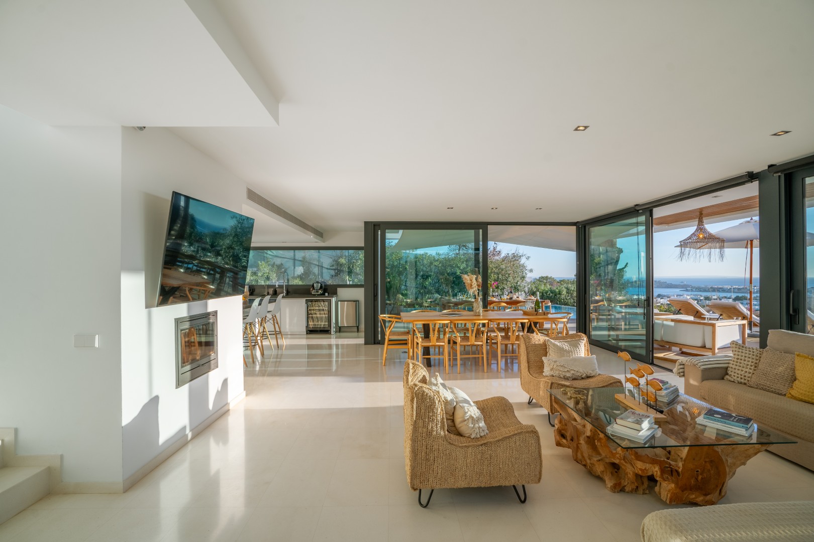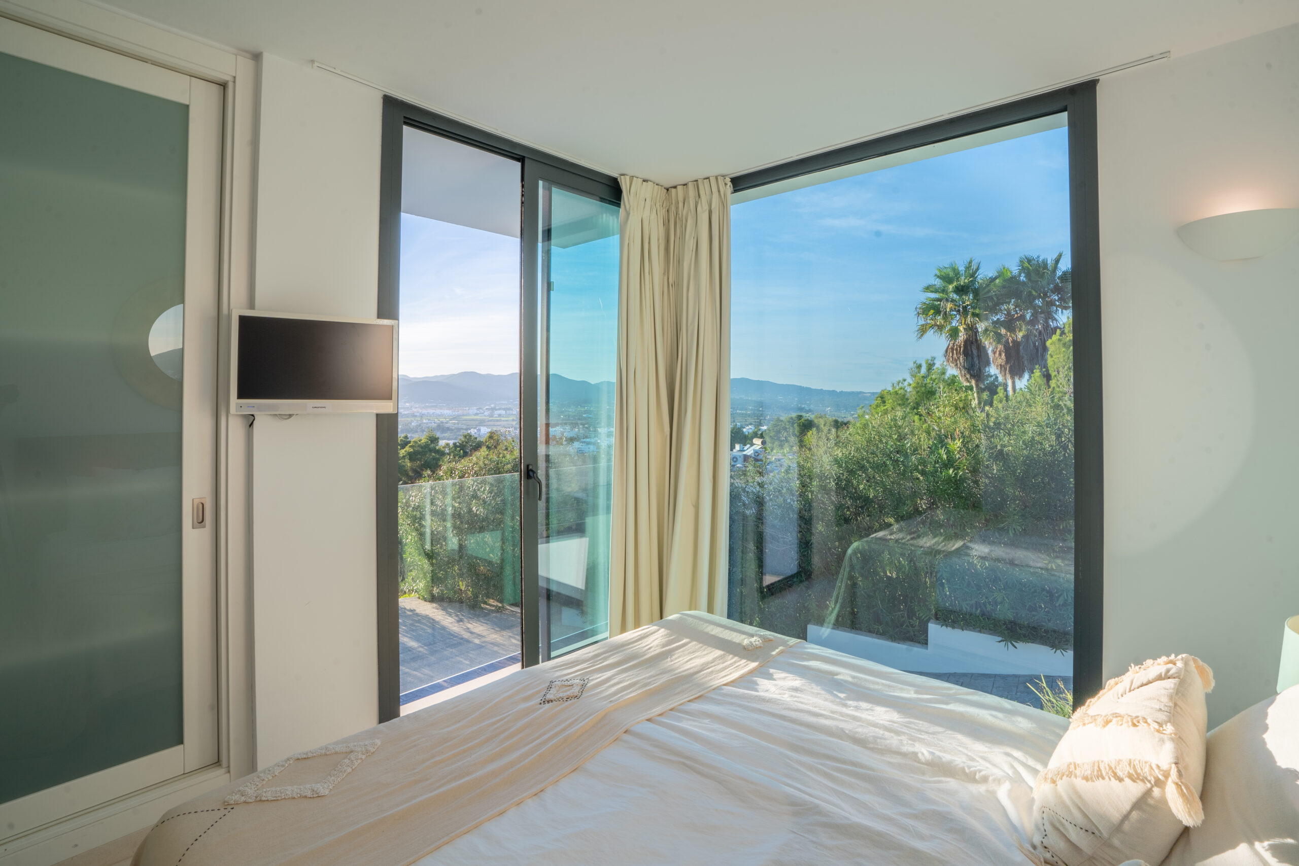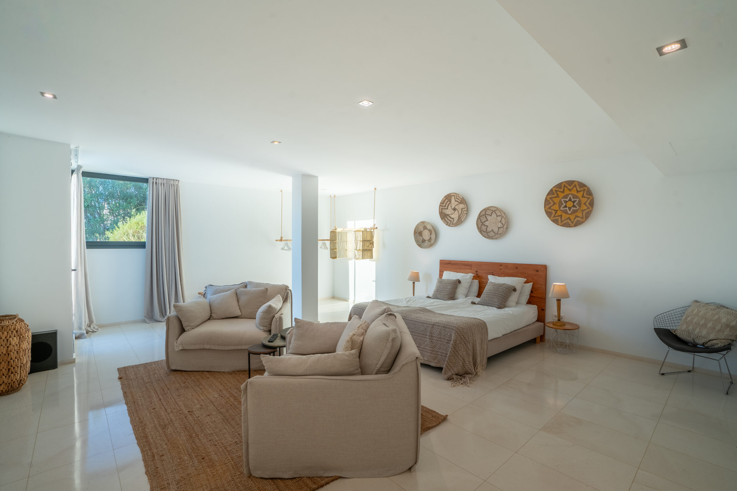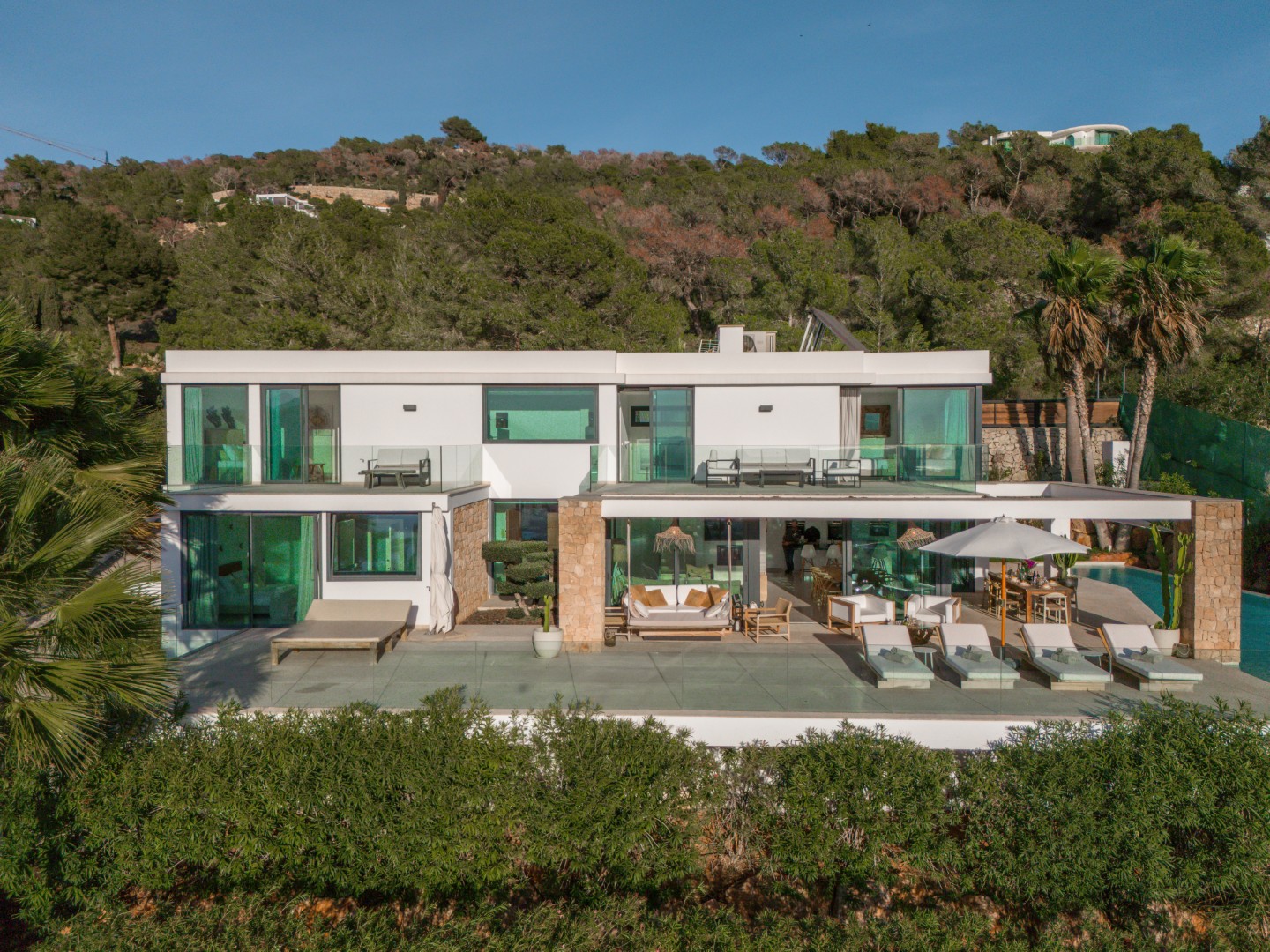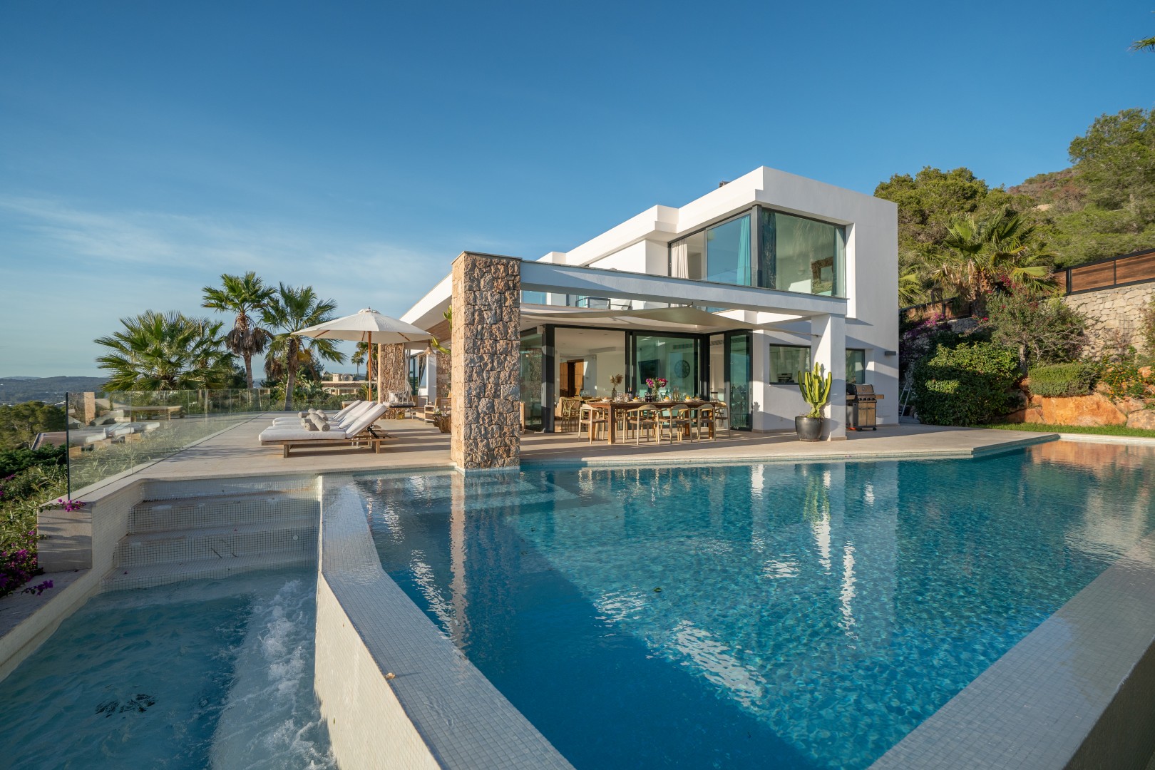 Im Außenbereich erstreckt sich der 18 Meter lange Infinity-Pool dem Horizont entgegen, umrahmt von Terrassen, die zum Sonnenbaden, Essen im Freien und geselligen Abenden einladen. Der umliegende mediterrane Garten mit Oliven-, Zitronen- und Orangenbäumen verleiht dem Anwesen Wärme und Authentizität. Mit 24-Stunden-Sicherheitsdienst, Highspeed-Internet und eleganten Ausstattungsdetails ist Pura Vista ein privates Refugium, das Luxus, Komfort und die schönsten Küstenlandschaften Ibizas vereint.