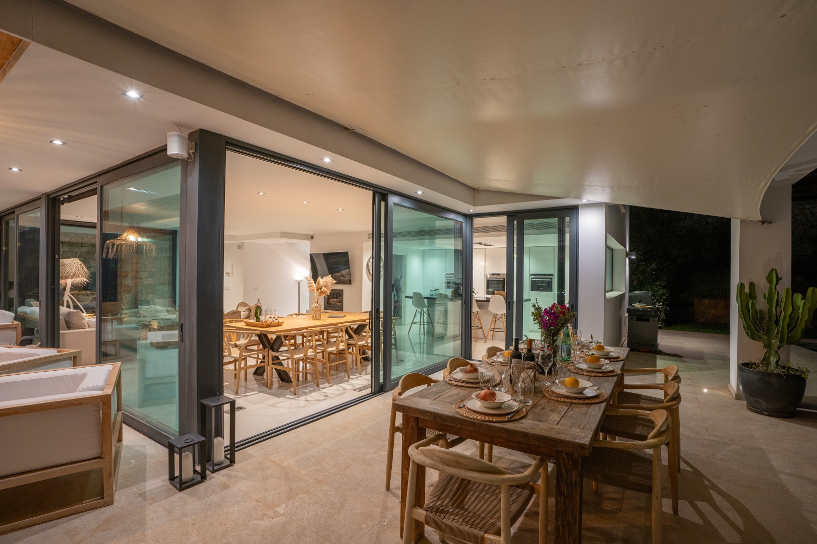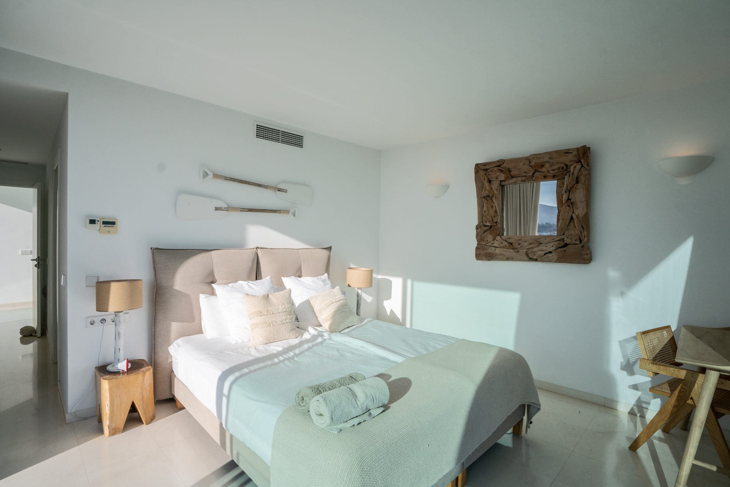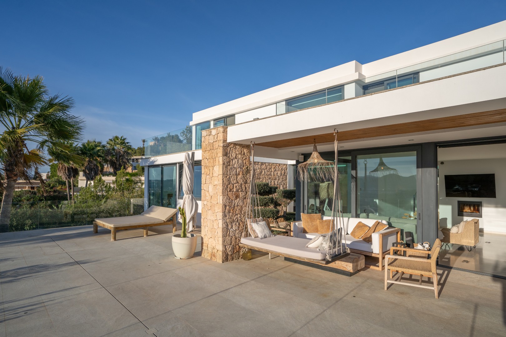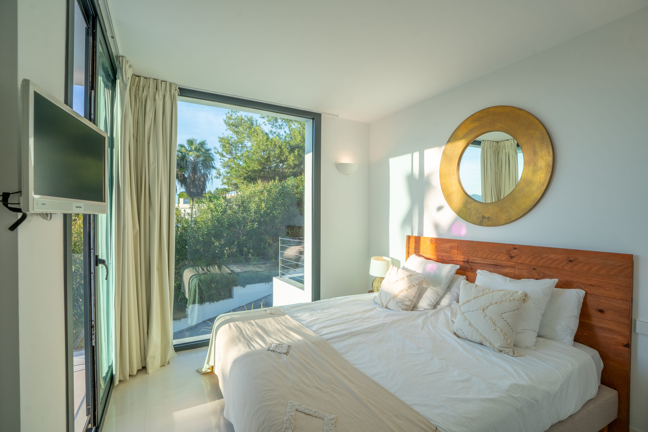 Im Außenbereich erstreckt sich der 18 Meter lange Infinity-Pool dem Horizont entgegen, umrahmt von Terrassen, die zum Sonnenbaden, Essen im Freien und geselligen Abenden einladen. Der umliegende mediterrane Garten mit Oliven-, Zitronen- und Orangenbäumen verleiht dem Anwesen Wärme und Authentizität. Mit 24-Stunden-Sicherheitsdienst, Highspeed-Internet und eleganten Ausstattungsdetails ist Pura Vista ein privates Refugium, das Luxus, Komfort und die schönsten Küstenlandschaften Ibizas vereint.