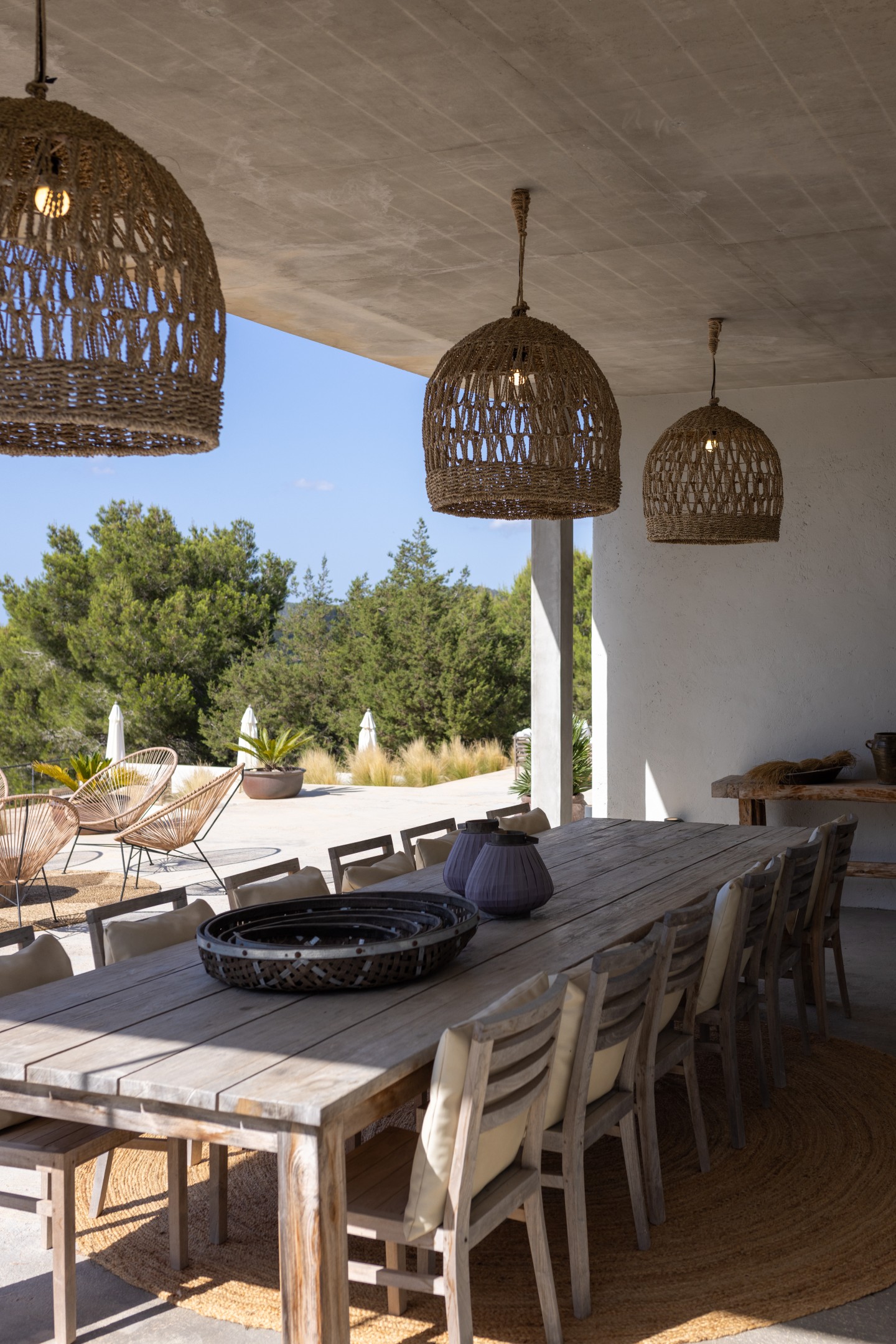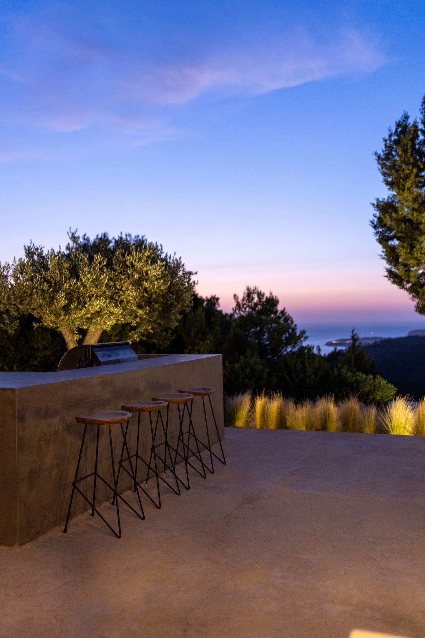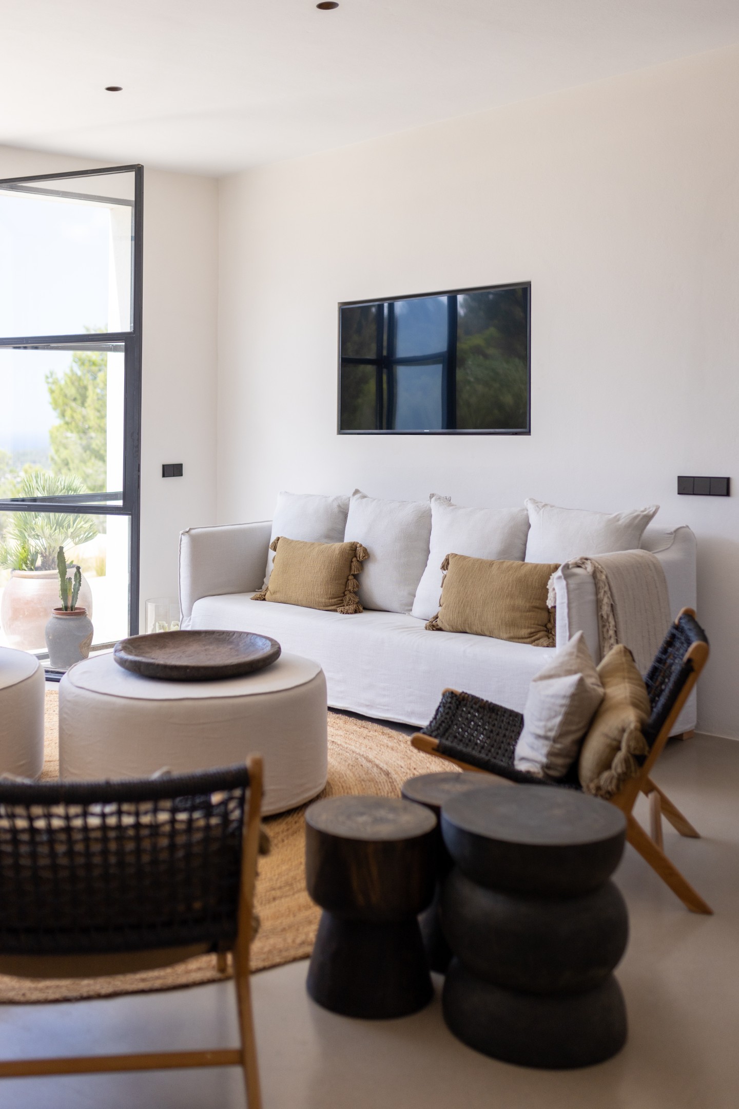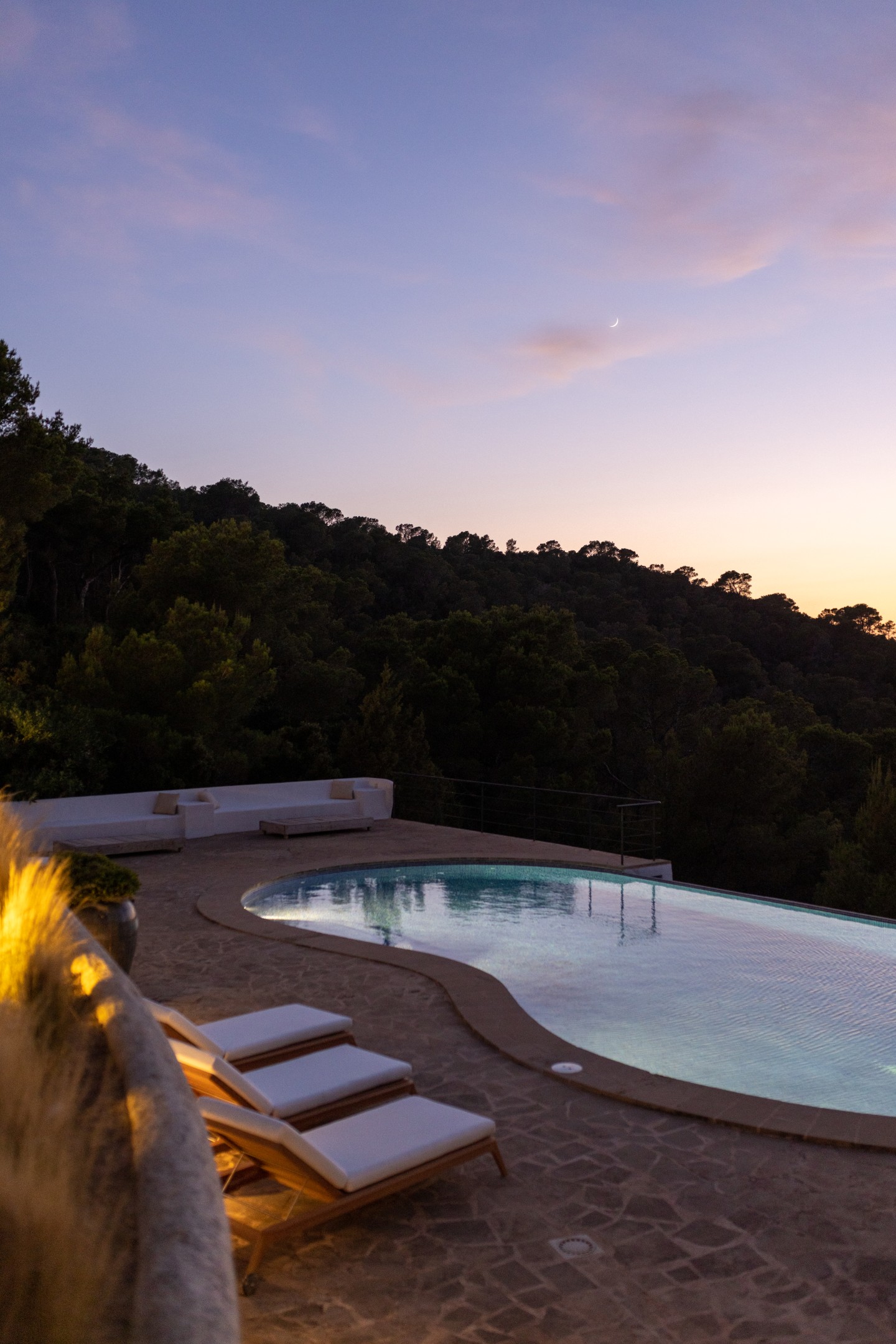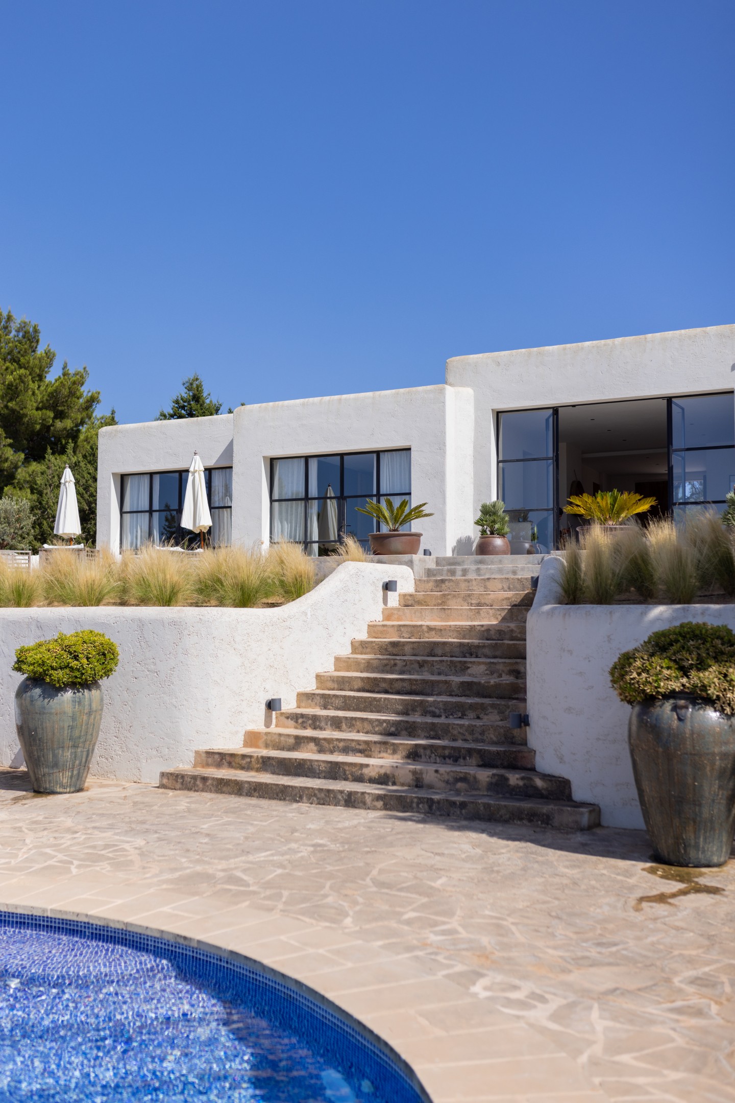 En el exterior, varias terrazas rodean una gran piscina, zonas lounge y un espacio de comedor con barbacoa y bar. Inmersa en un entorno tranquilo y enmarcada por el mar y las colinas, Can Nebu es un refugio sereno que captura la esencia de la sofisticación relajada de Ibiza.