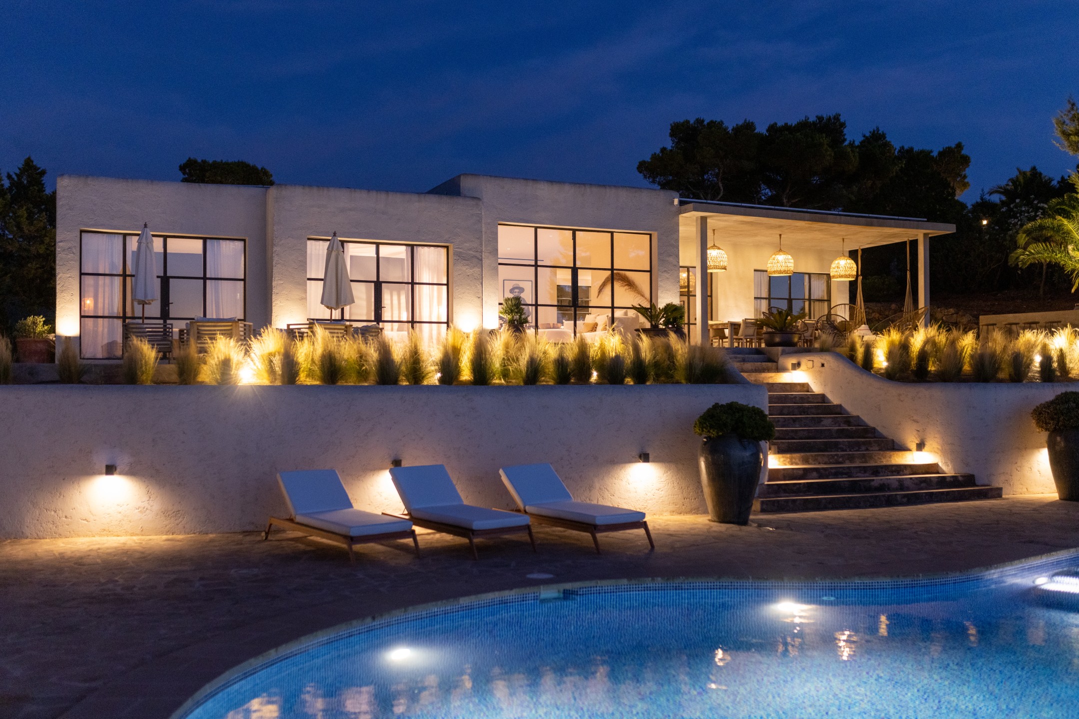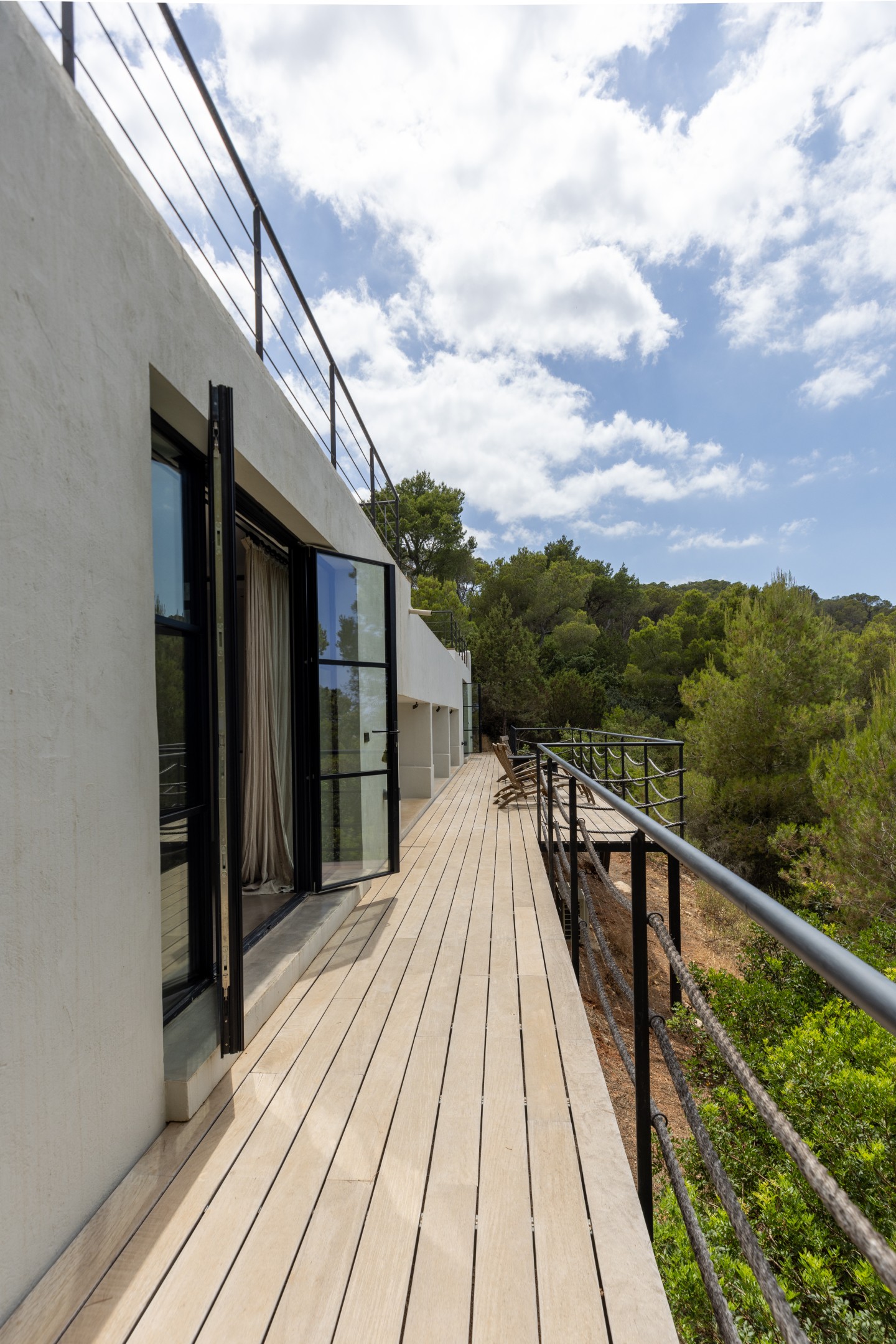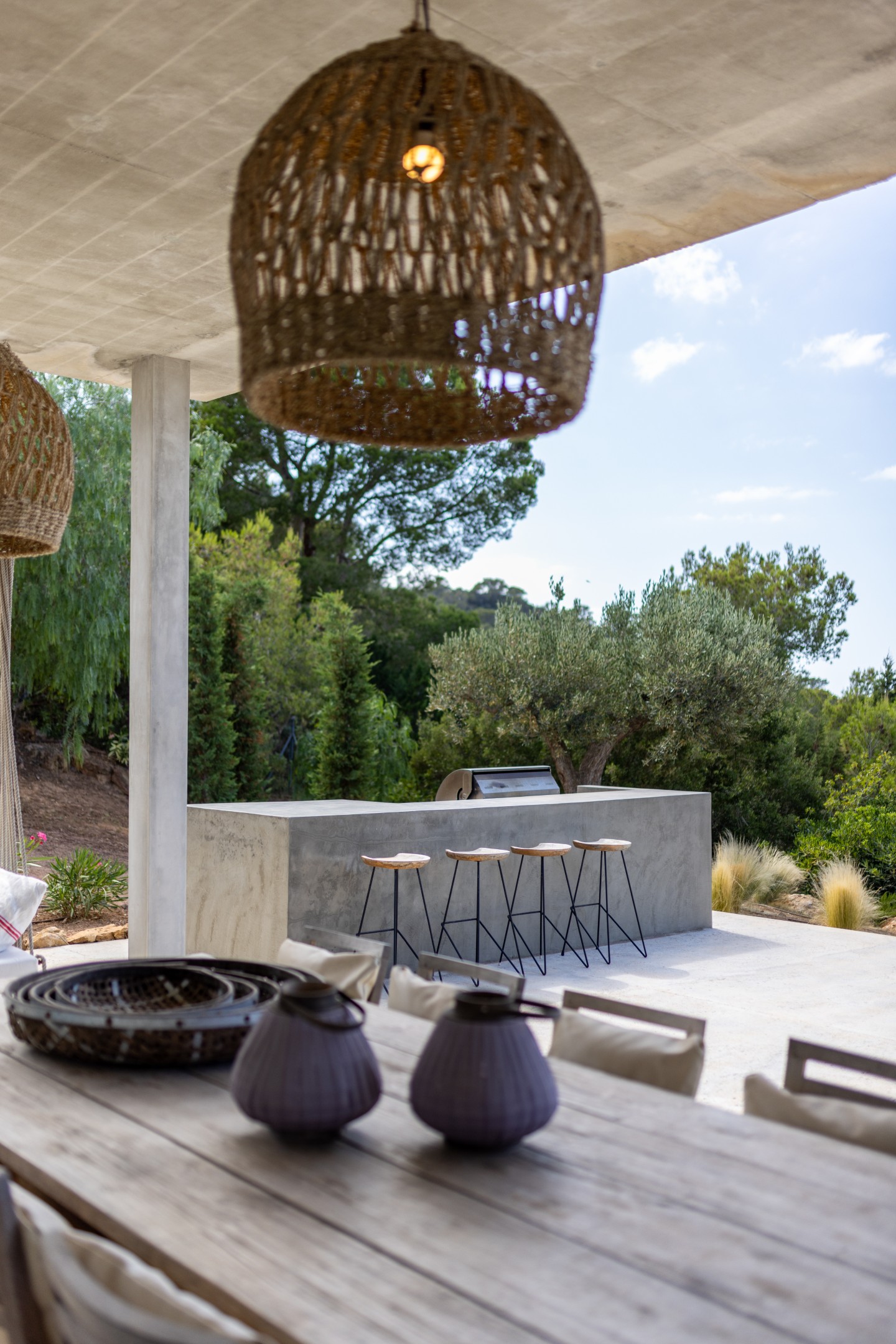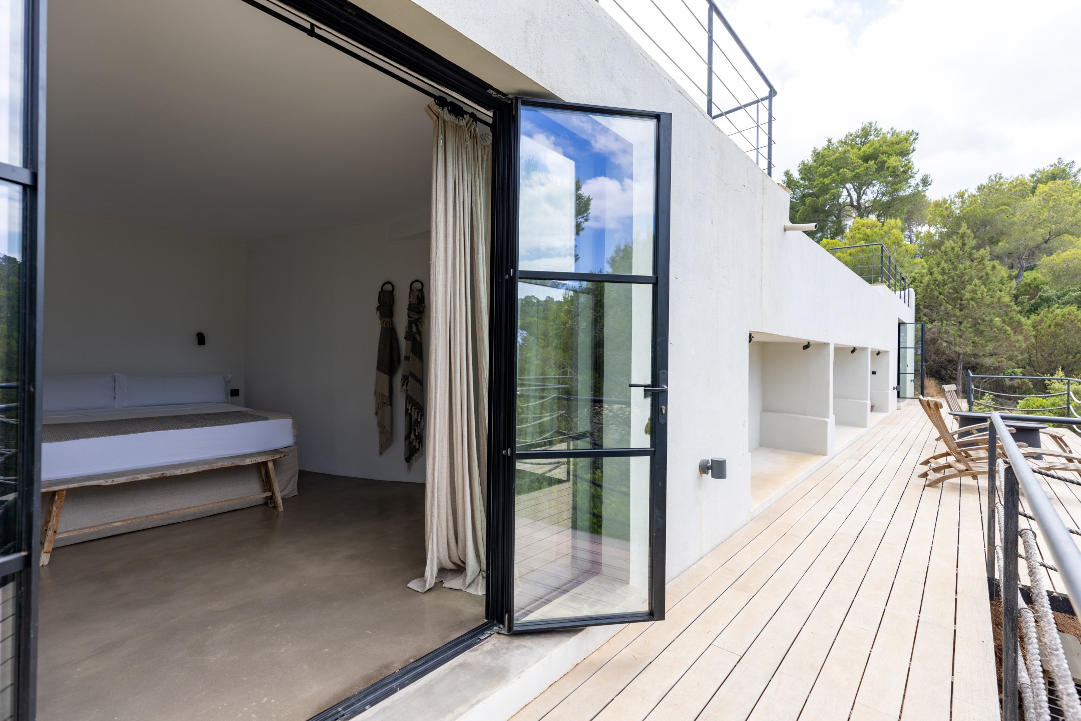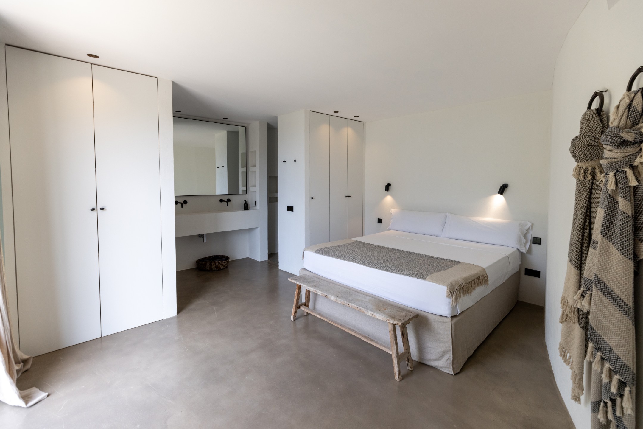 En el exterior, varias terrazas rodean una gran piscina, zonas lounge y un espacio de comedor con barbacoa y bar. Inmersa en un entorno tranquilo y enmarcada por el mar y las colinas, Can Nebu es un refugio sereno que captura la esencia de la sofisticación relajada de Ibiza.