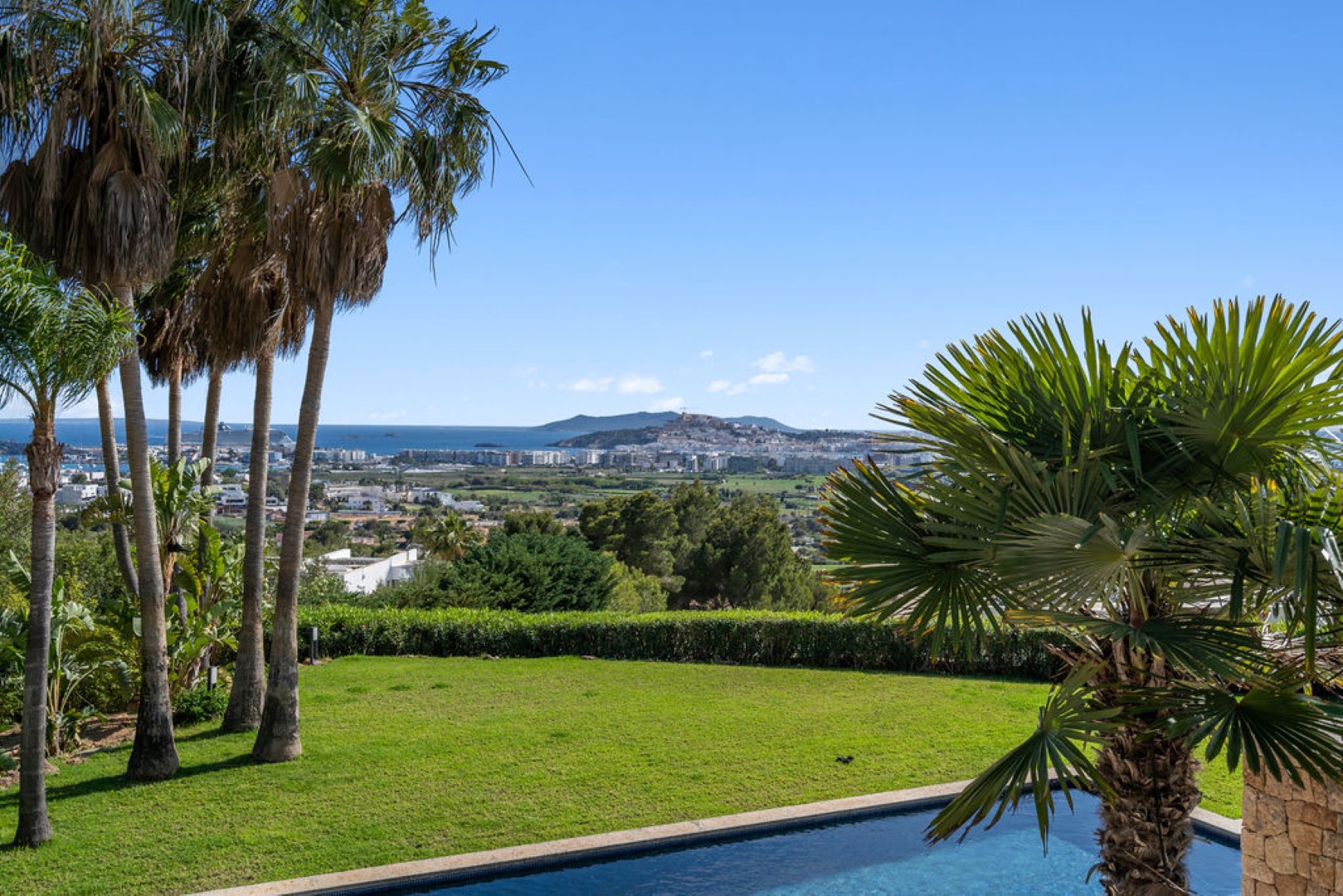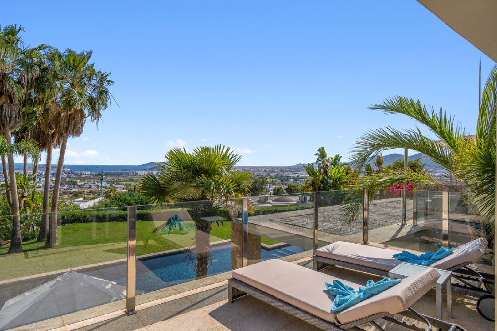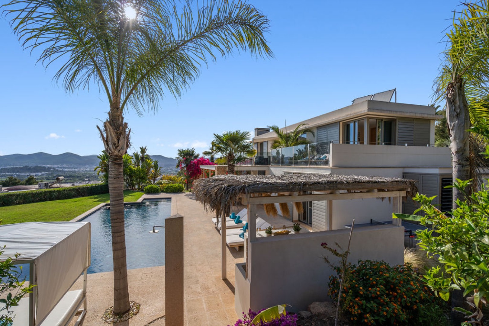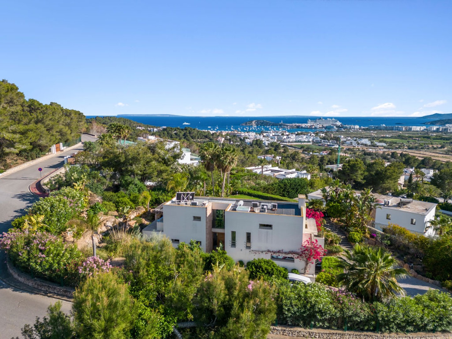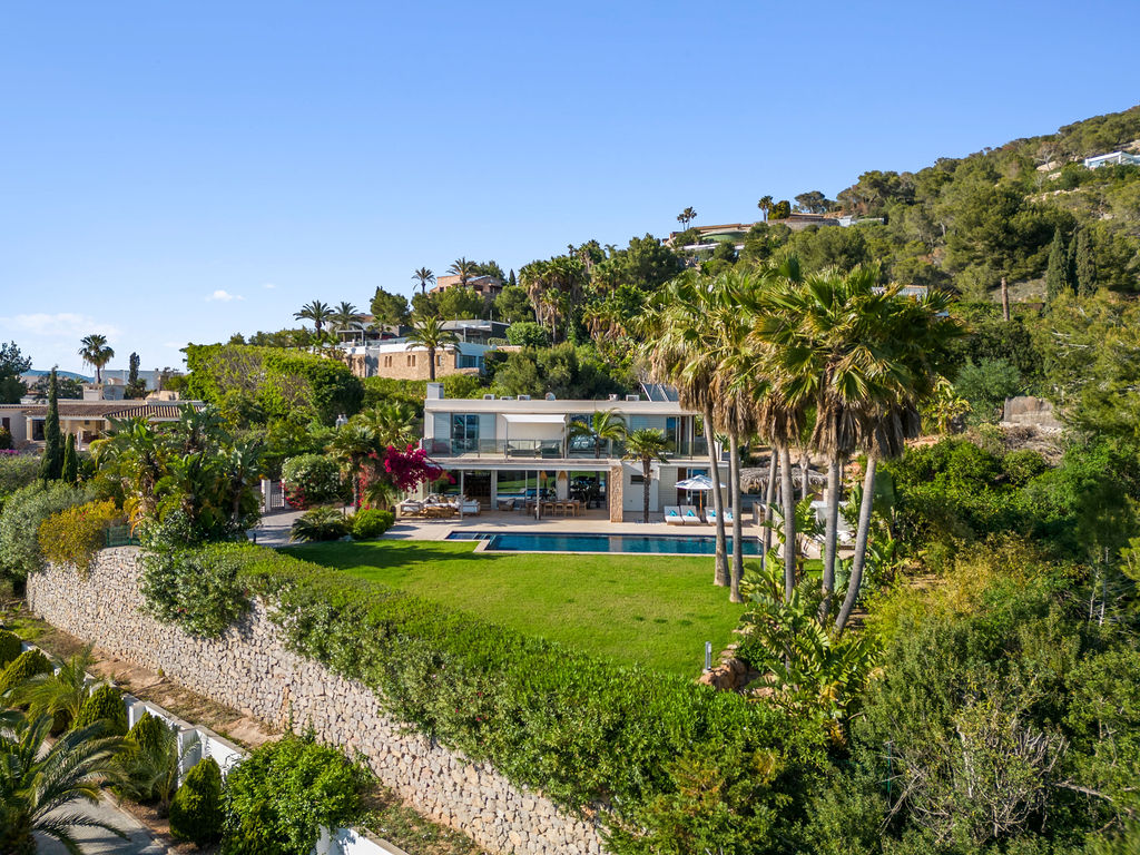 Villa Esteban is a modern five-bedroom residence in a private gated community with sweeping views over Ibiza Town and the sea. Designed for both comfort and elegance, it combines refined interiors, spacious terraces, and lush gardens with fruit trees to create a peaceful retreat just minutes from the island’s vibrant center.
