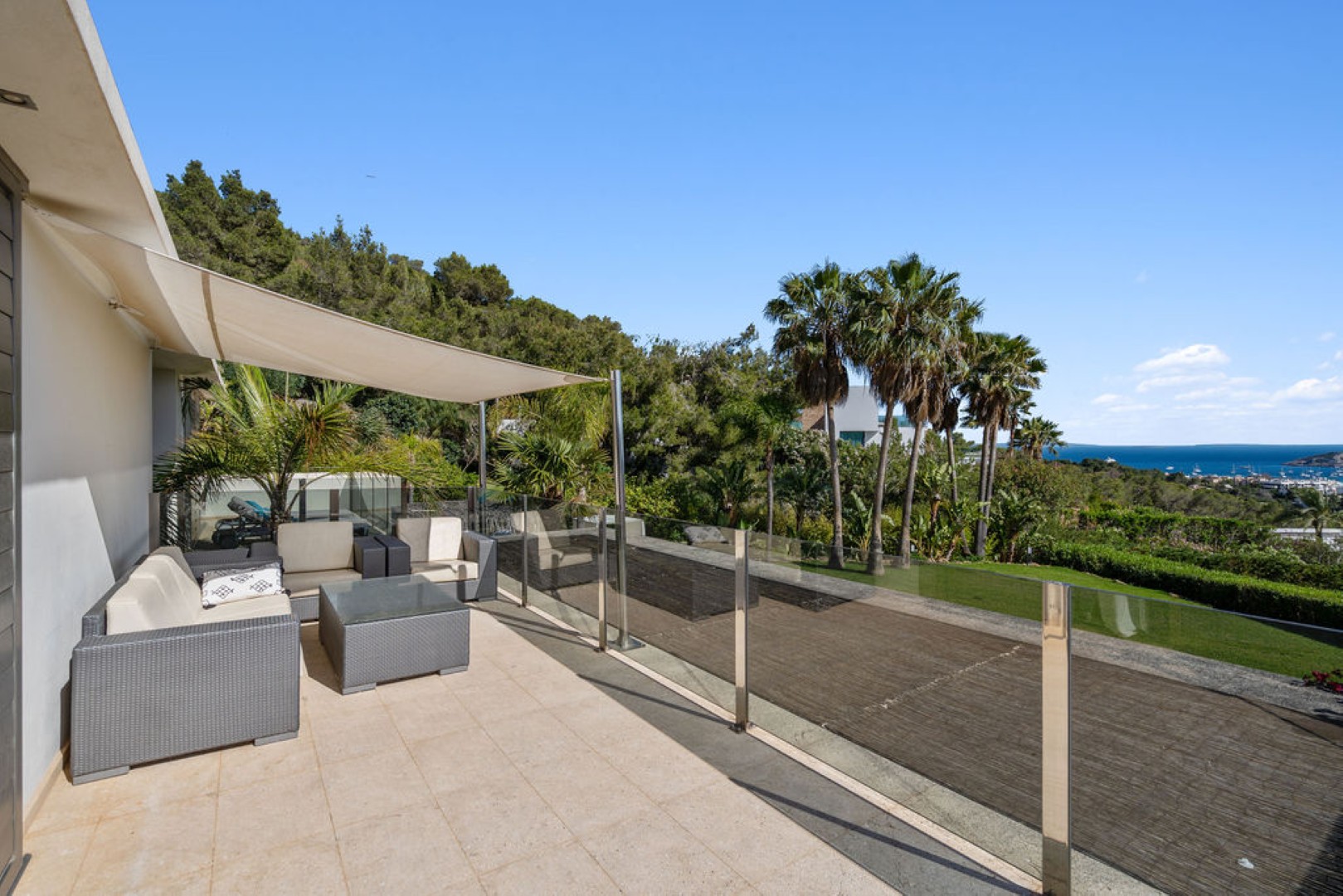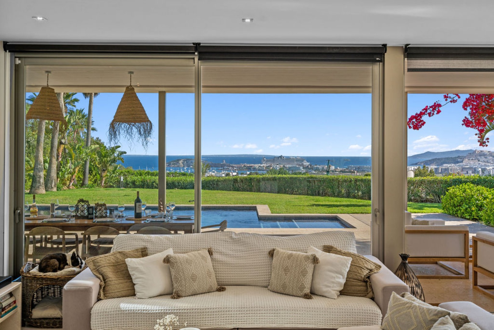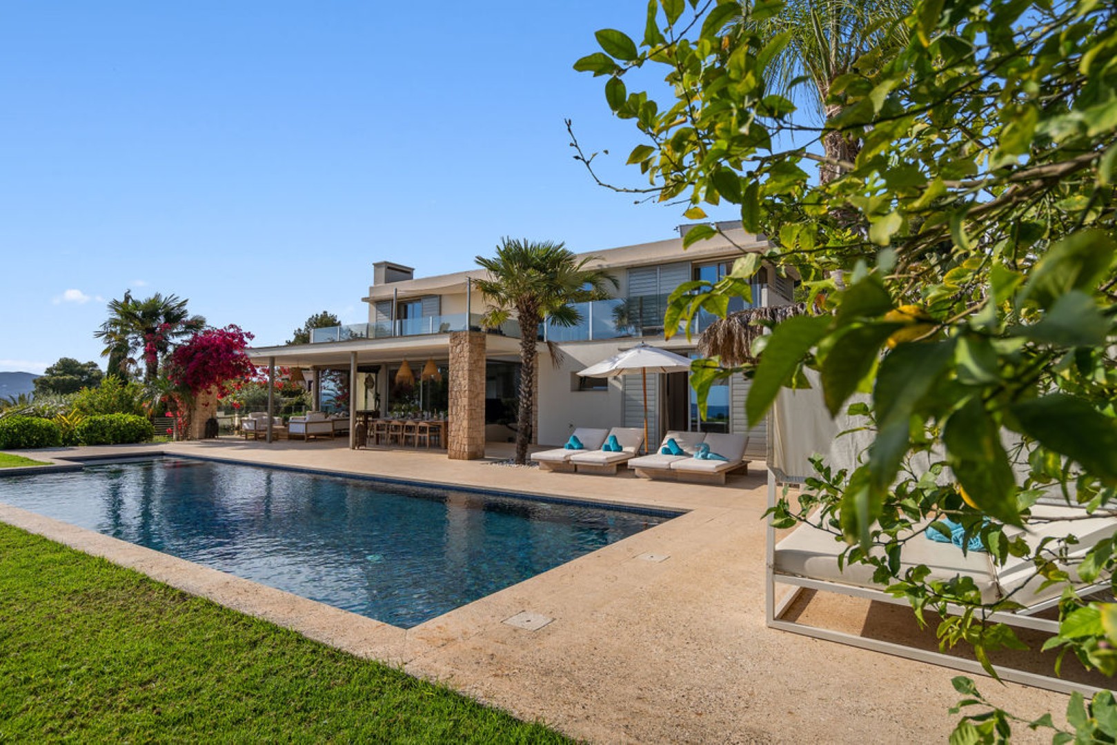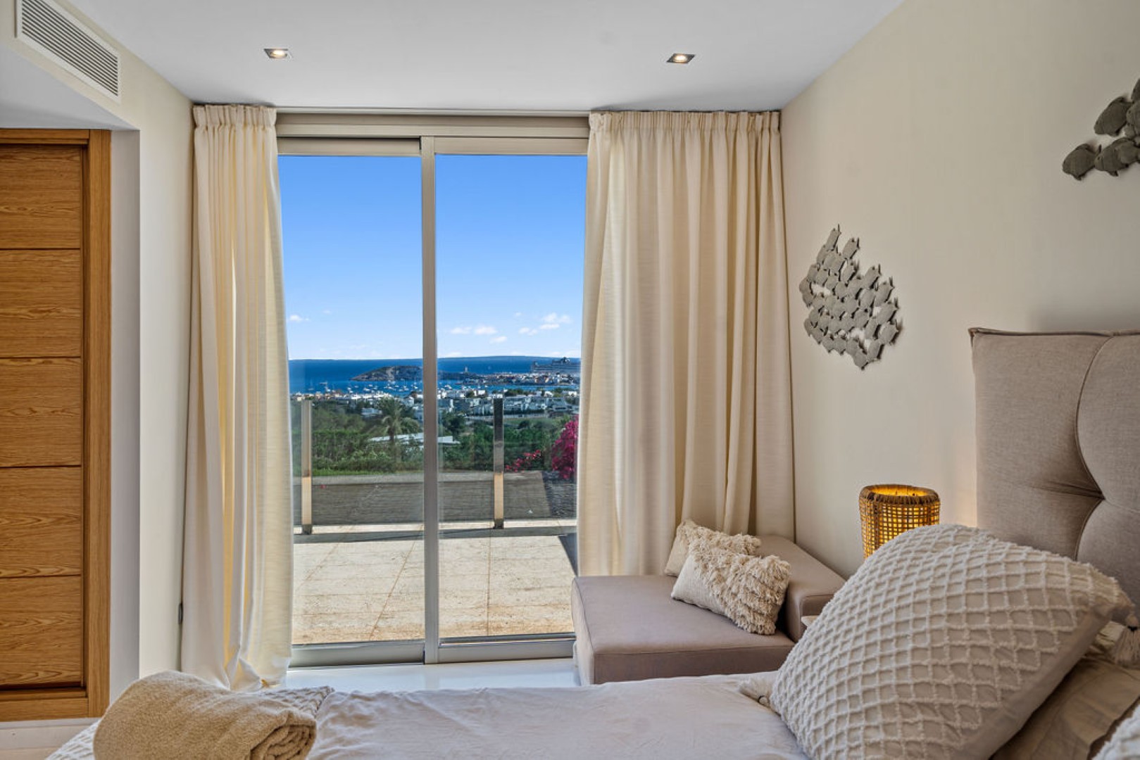 Villa Esteban is a modern five-bedroom residence in a private gated community with sweeping views over Ibiza Town and the sea. Designed for both comfort and elegance, it combines refined interiors, spacious terraces, and lush gardens with fruit trees to create a peaceful retreat just minutes from the island’s vibrant center.