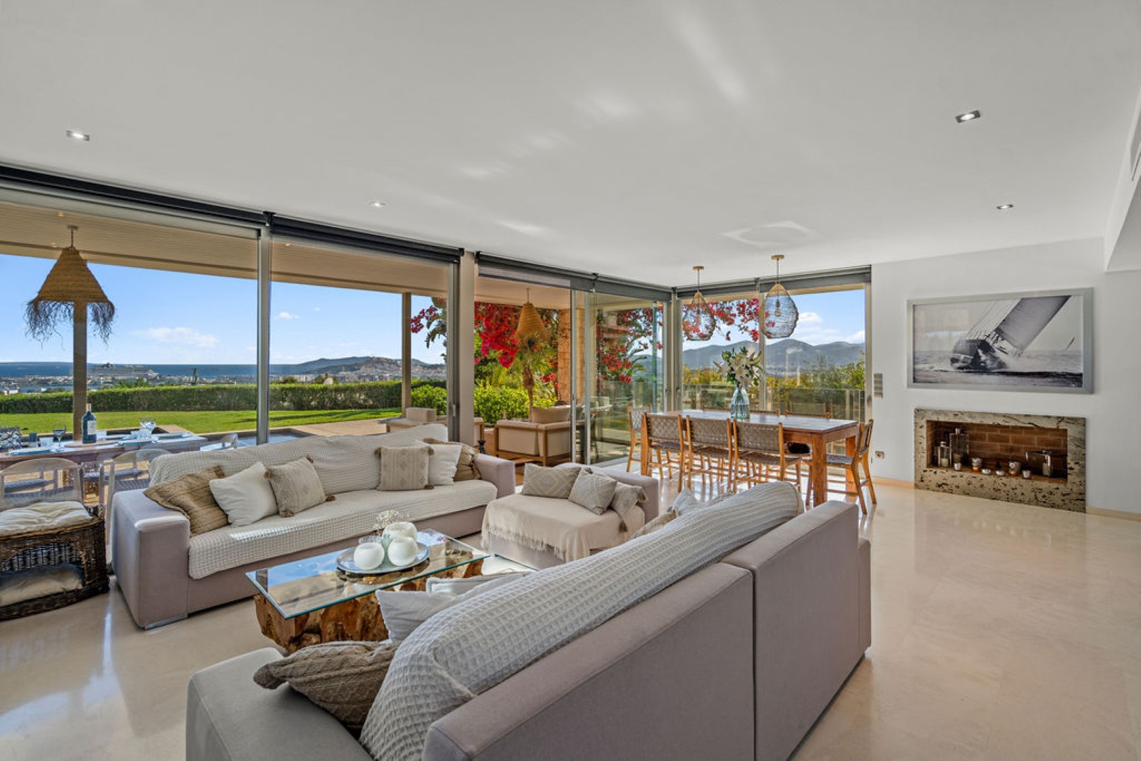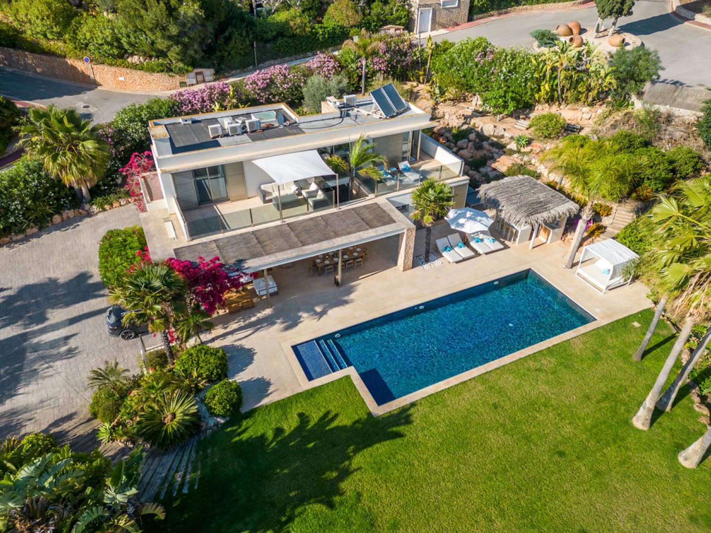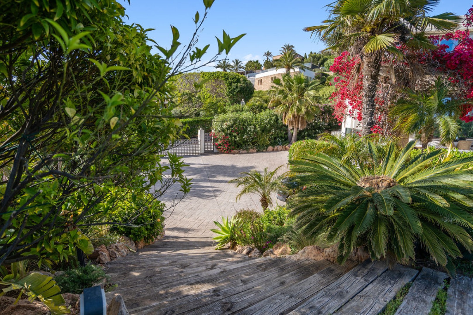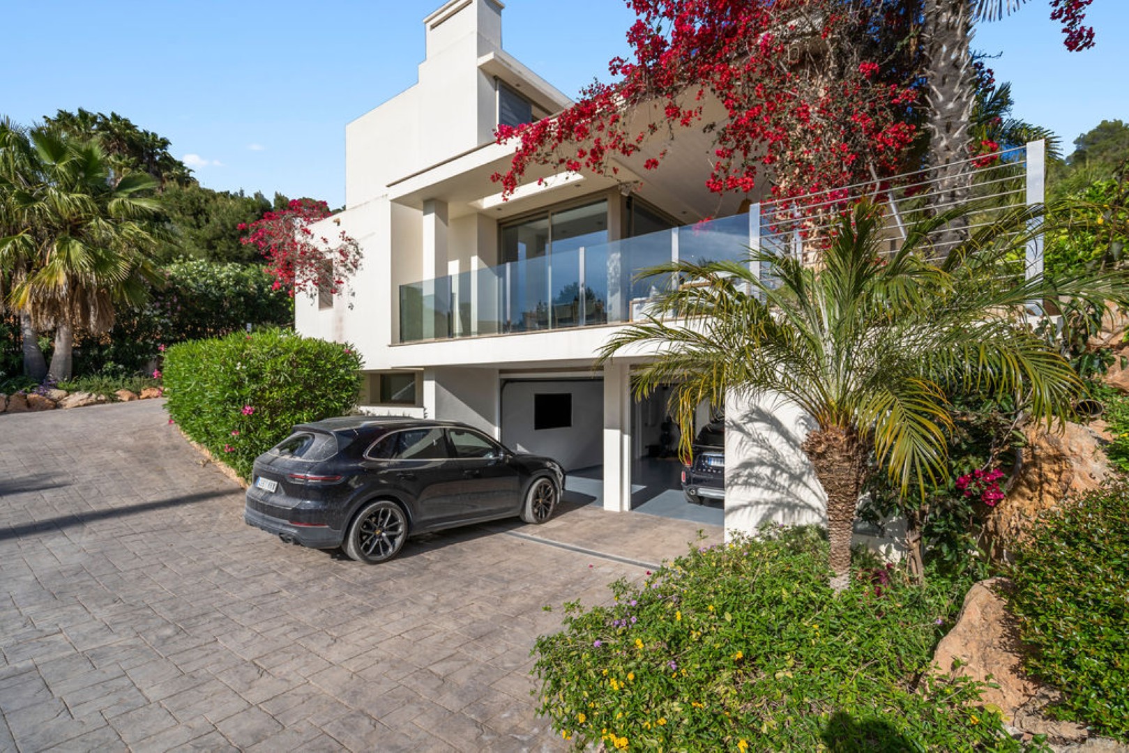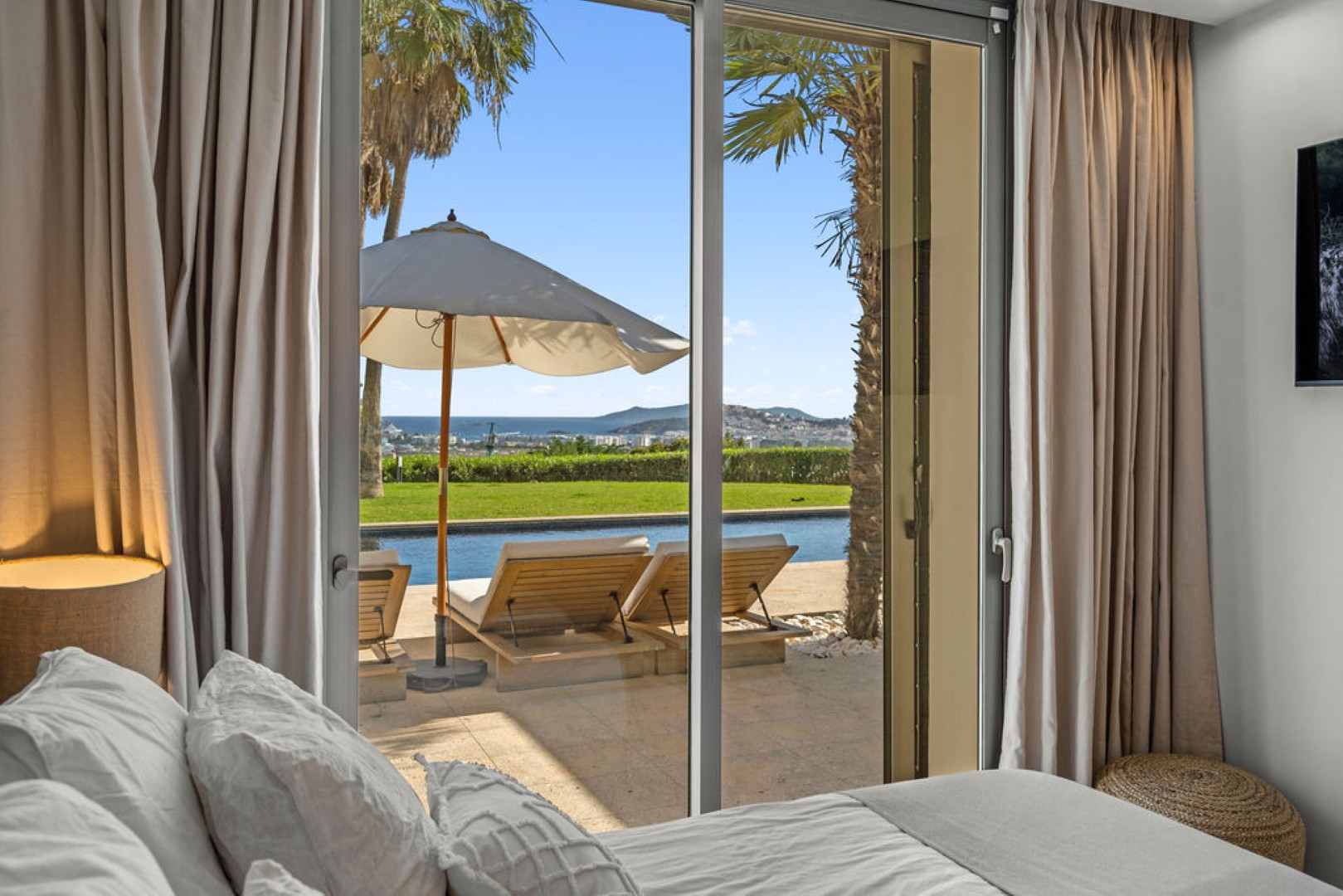 Villa Esteban is a modern five-bedroom residence in a private gated community with sweeping views over Ibiza Town and the sea. Designed for both comfort and elegance, it combines refined interiors, spacious terraces, and lush gardens with fruit trees to create a peaceful retreat just minutes from the island’s vibrant center.