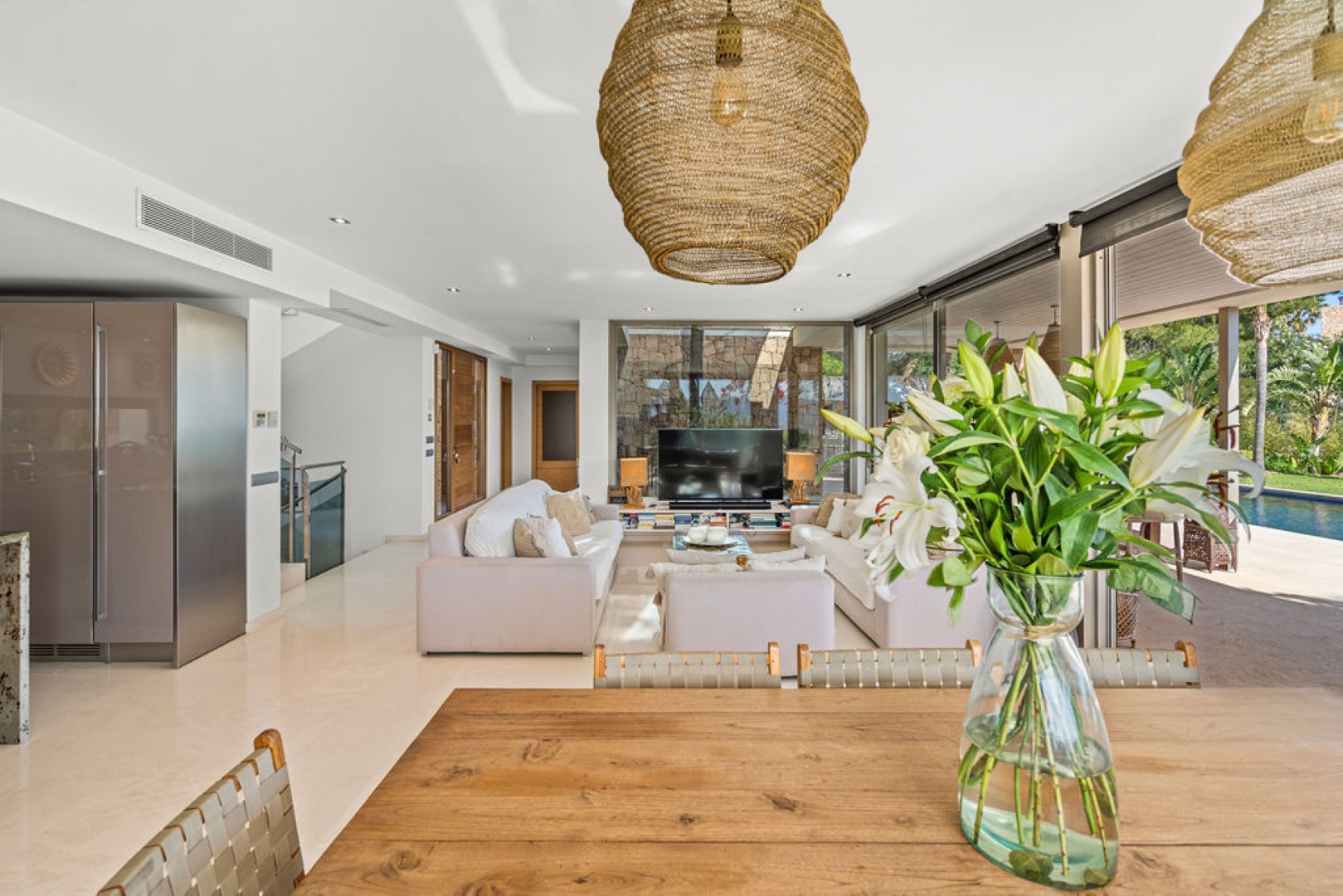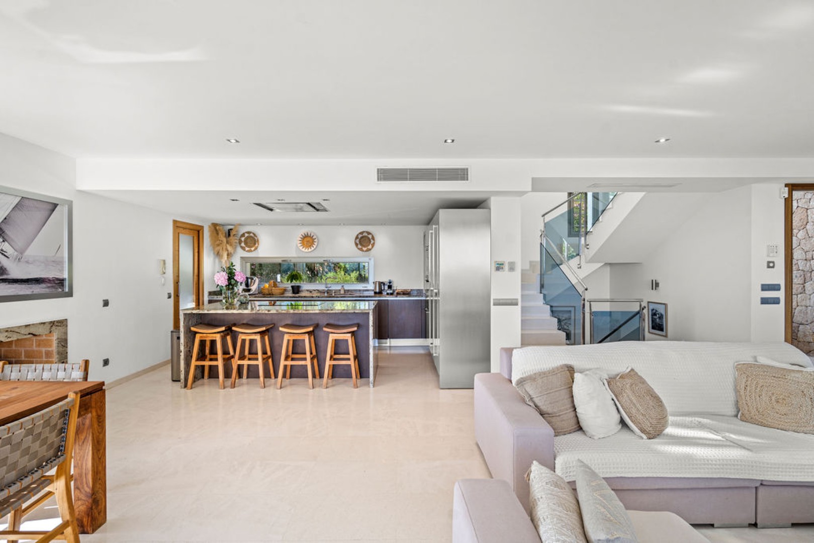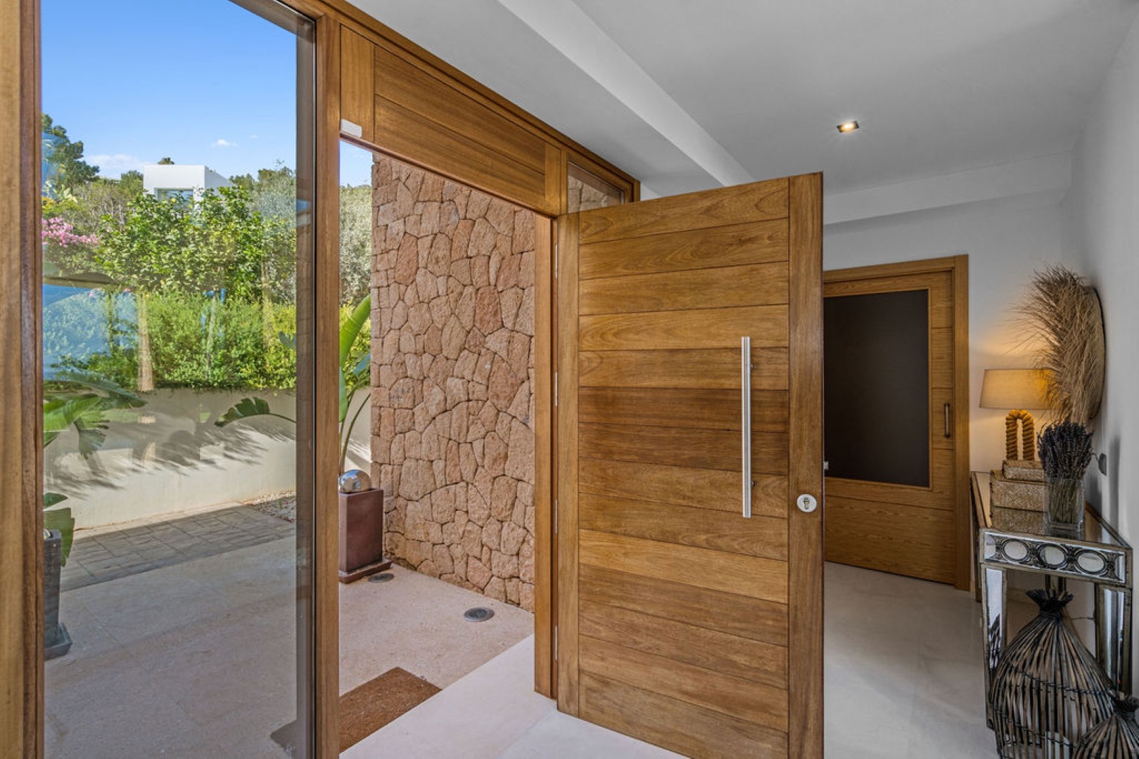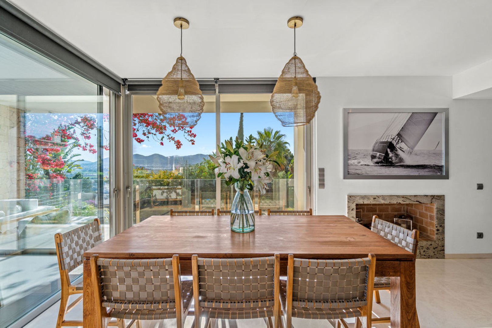 Villa Esteban is a modern five-bedroom residence in a private gated community with sweeping views over Ibiza Town and the sea. Designed for both comfort and elegance, it combines refined interiors, spacious terraces, and lush gardens with fruit trees to create a peaceful retreat just minutes from the island’s vibrant center.