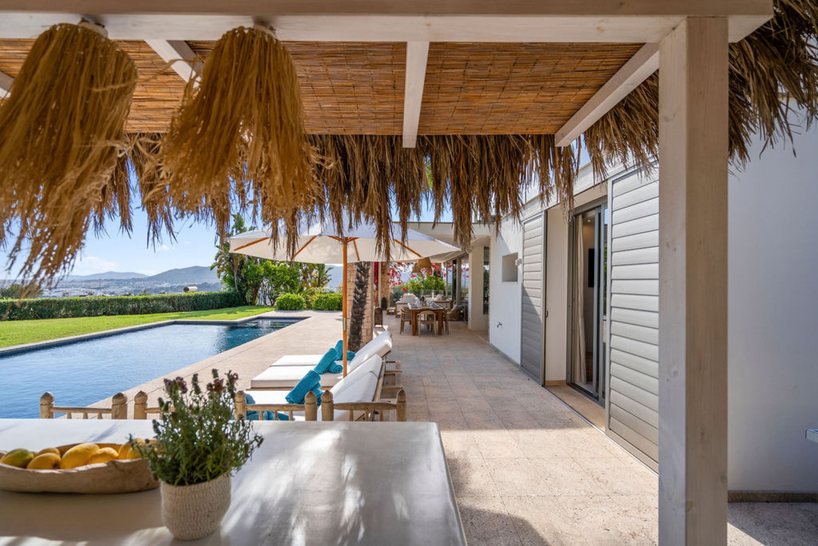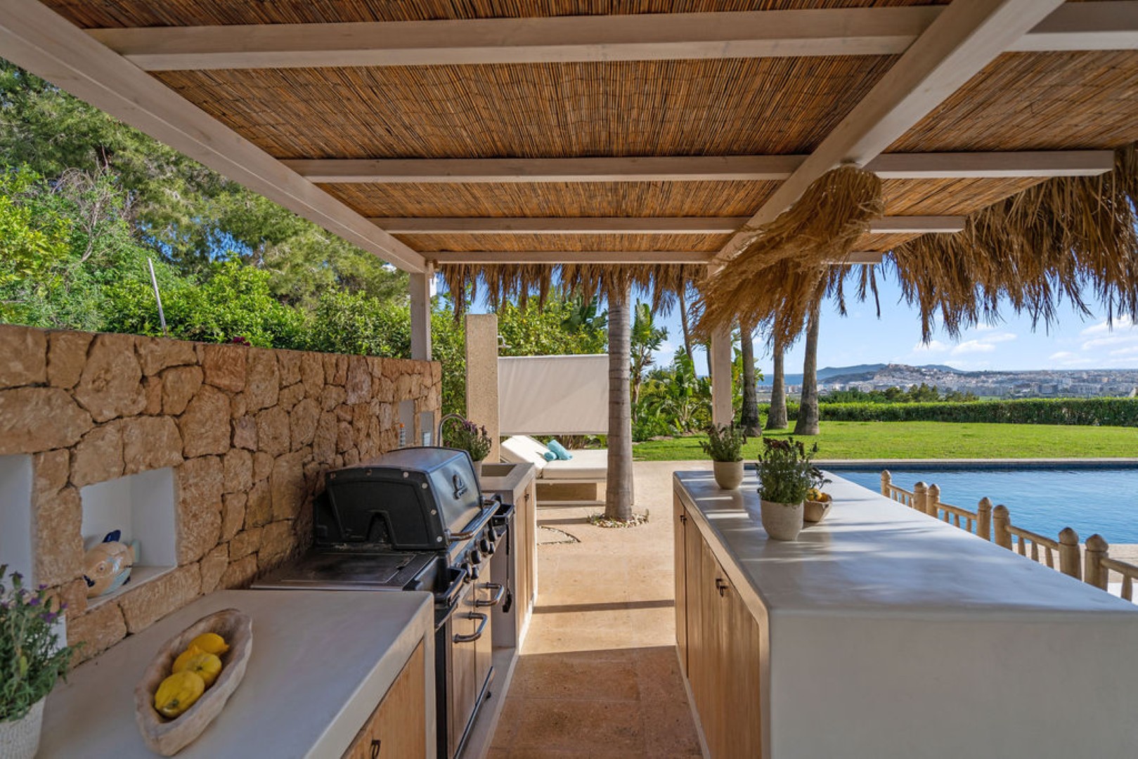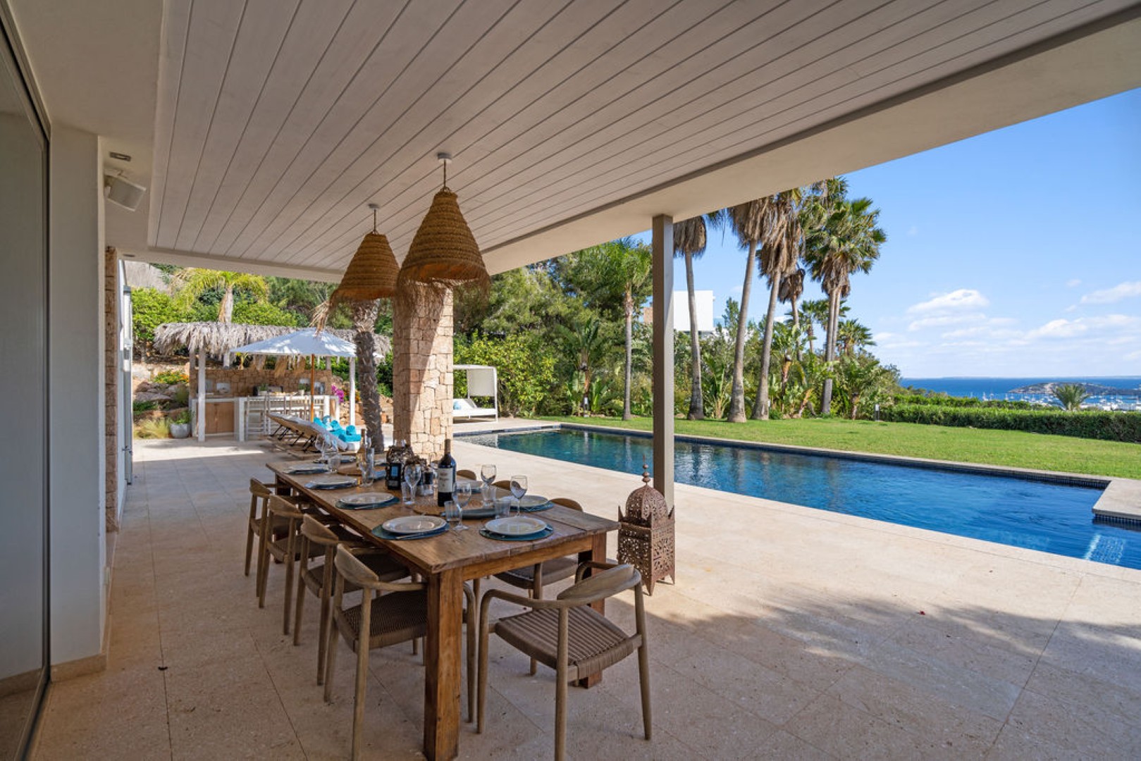 Hidden behind the first row above Ibiza Town, the villa offers complete privacy and uninterrupted views of Dalt Vila and the coastline. Each bedroom features its own en-suite bathroom, while the bright open plan living and dining areas extend seamlessly to the outdoor spaces. A private pool with sun loungers, shaded seating areas, and a fully equipped outdoor kitchen with barbecue invite relaxed outdoor living. Guests can also enjoy a fitness and games area with gym equipment, billiard table, and ping pong table. Blending luxury and authenticity, Villa Esteban provides a tranquil yet convenient setting for families and groups seeking a stylish Ibiza getaway.